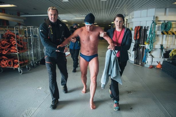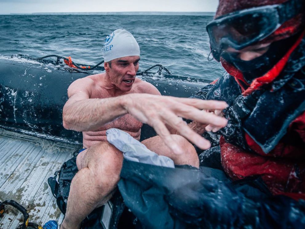 在持续零度以下的海水里,刘易斯身上只穿着一条蓝色游泳短裤完成了游泳,他还戴着一个印有联合国环境计划标志的游泳帽。
